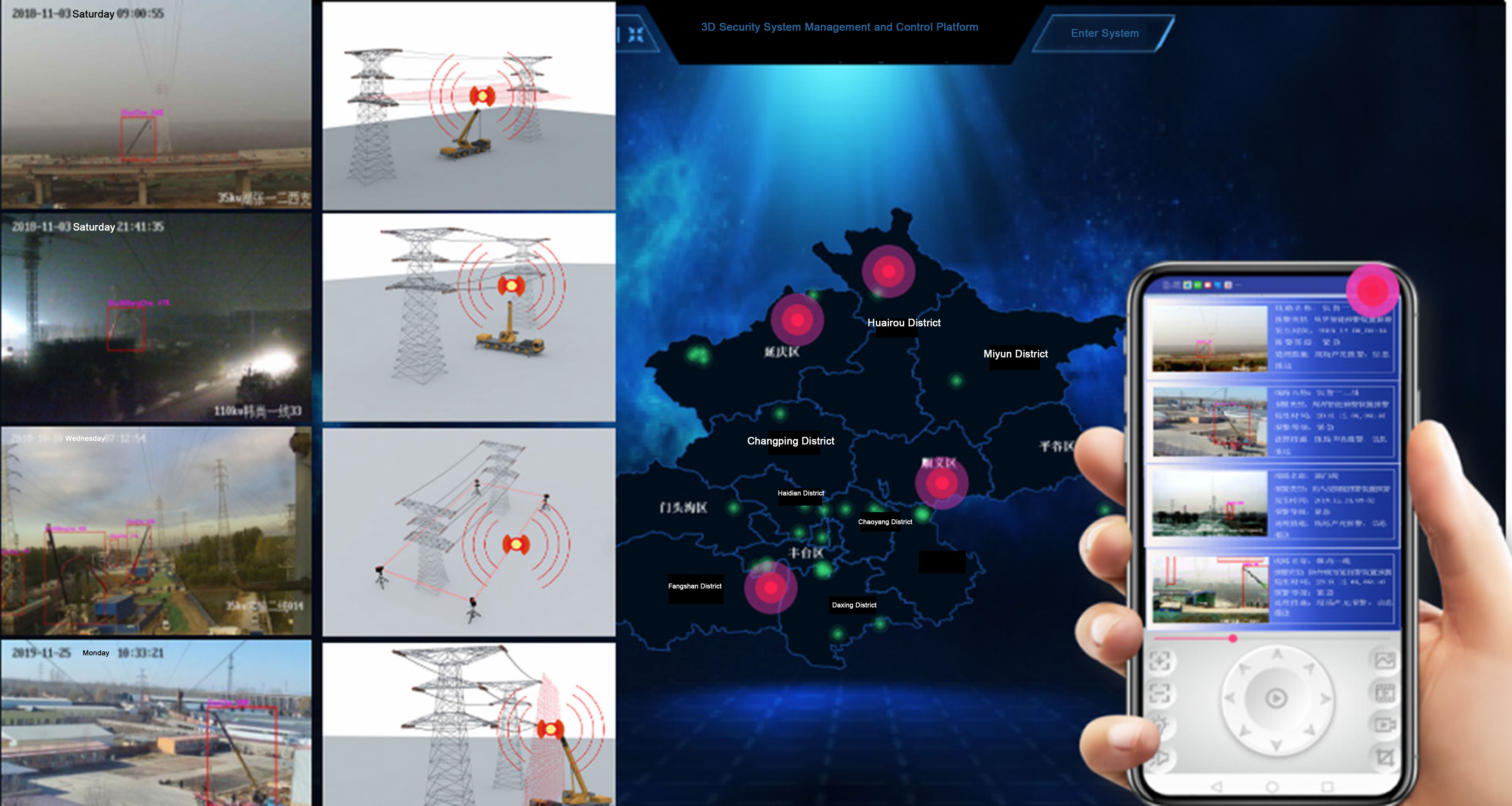 The power safety management and control system leverages cloud computing, IoT, and AI technologies to integrate advanced technical safeguards with traditional personnel protection measures, enabling 24/7 automated monitoring at work sites. Through 3D protection of risk zones, real-time alerts for violations or external damage, and proactive hazard management, the system eliminates operational accidents and maximizes personnel safety. It also utilizes multiple advanced technologies for intelligent safety management at various power construction sites and warehouses.