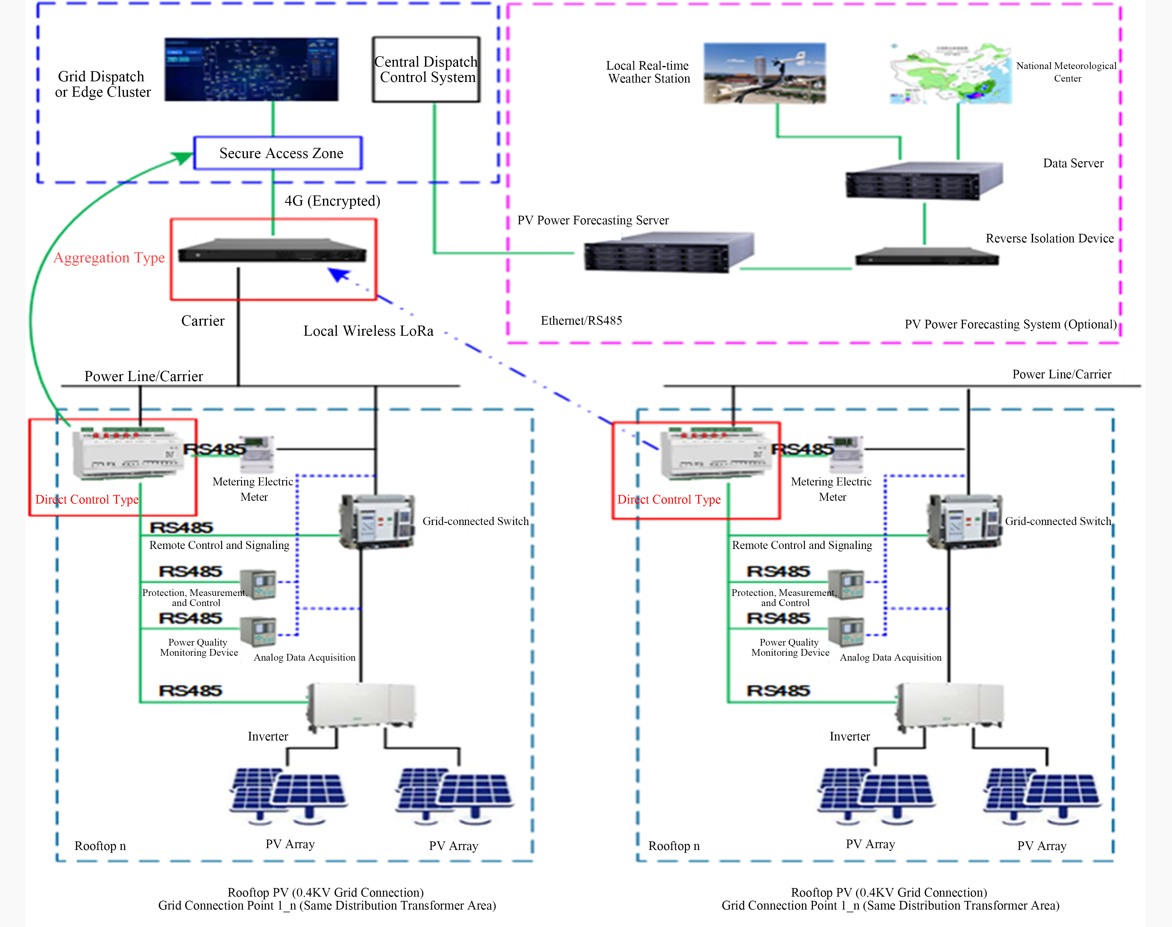 It receives grid dispatch commands to remotely regulate and control distributed energy equipment, such as adjusting the active/reactive power of PV inverters and controlling the charging/discharging of energy storage devices, achieving precise regulation of renewable energy output to ensure grid safety and stable operation while improving renewable energy accommodation capacity.