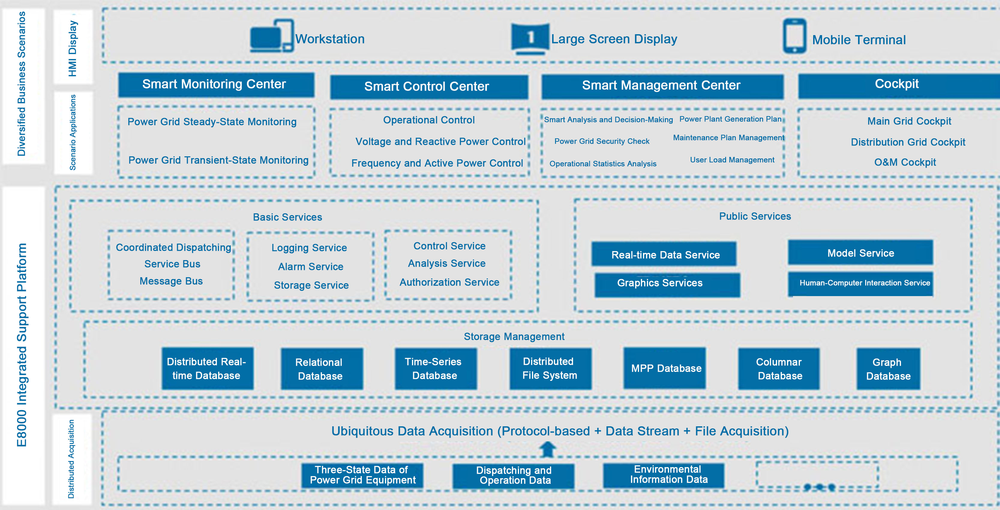The Smart Dispatching Technical Support System (E8000) is a new generation system developed with a Service-Oriented Architecture (SOA). It complies with international standards IEC 61970/IEC 61968 and fully incorporates specifications from systems such as the State Grid Corporation of China's power grid dispatching and control system and China Southern Power Grid's integrated smart grid operation system. As a highly integrated system for dispatching operations, the E8000 system achieves horizontal integration of various specialized application systems within the power grid dispatching and control center. It consolidates traditionally separate business applications—such as dispatching, centralized control, distribution, relay protection, and security automation—into a single system. Concurrently, it facilitates vertical connection across dispatching control centers at all levels as well as plants and substations, enabling the sharing and coordination of information for planning, data management, analysis, and control in dispatching operations. It serves as a comprehensive solution for power dispatching and control centers of all types and levels to realize smart grid operation control and optimized management.